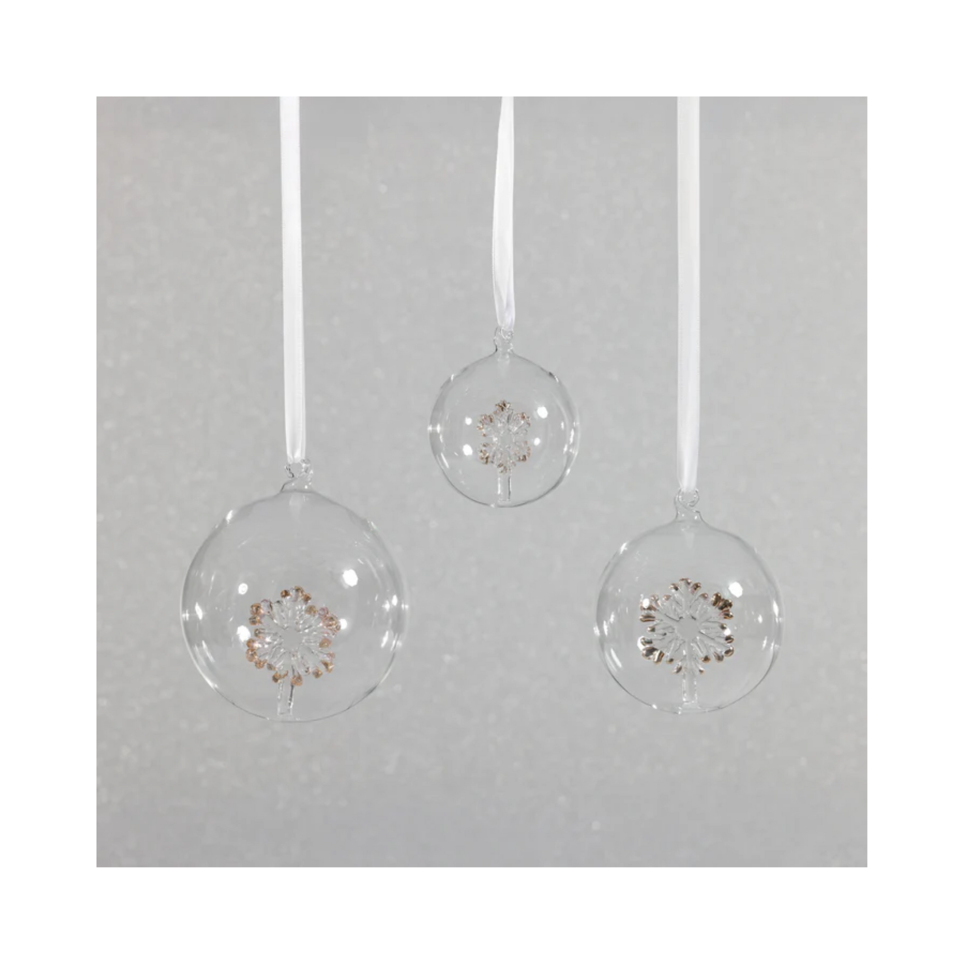 This 4-inch clear glass ball ornament features a delicate snowflake encased within, creating an elegant and timeless decoration. Its transparent design allows light to pass through, highlighting the intricate details of the miniature snowflake inside. Perfect for adding a natural touch to holiday decor or year-round display, this ornament brings a subtle charm to any setting.