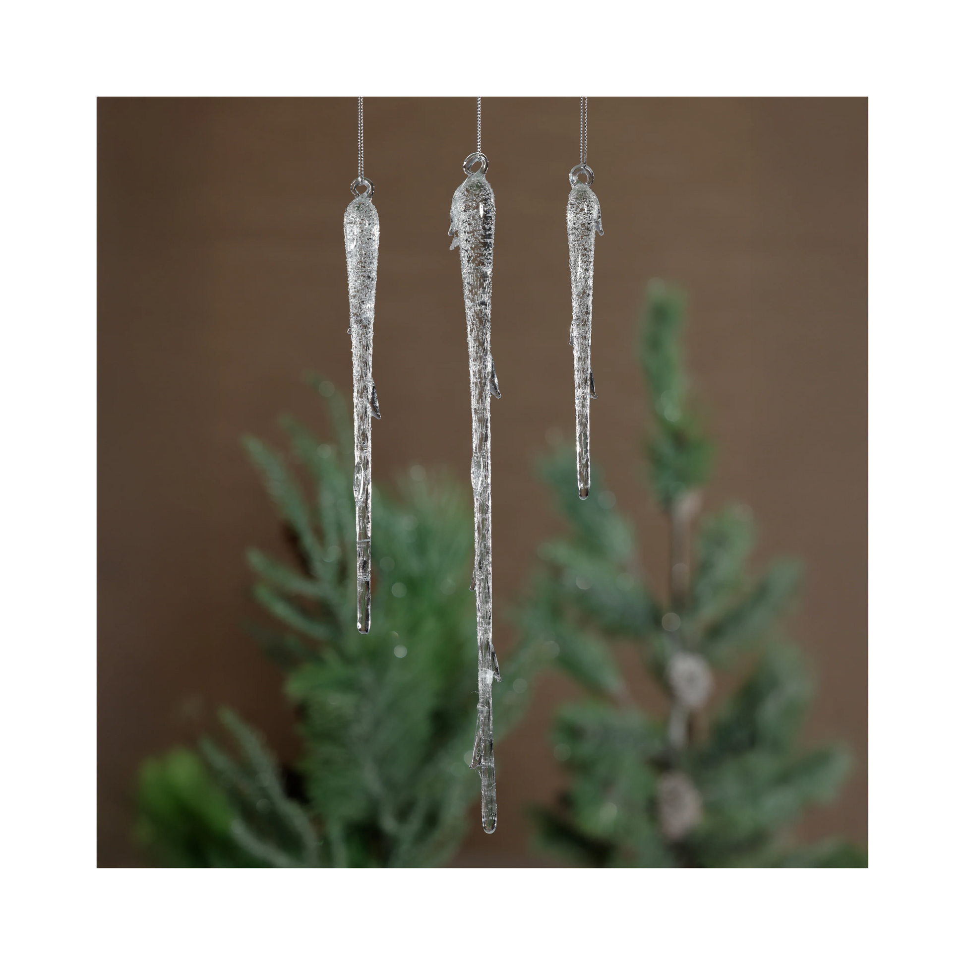 This set of three clear glass icicle ornaments features varying lengths of 6 inches, 7.75 inches, and 11.75 inches. Their elegant, transparent design adds a delicate shimmer to holiday décor, creating a graceful and versatile accent for Christmas trees, wreaths, or garlands. Crafted to catch light beautifully, these ornaments bring a subtle sparkle that enhances any festive setting.