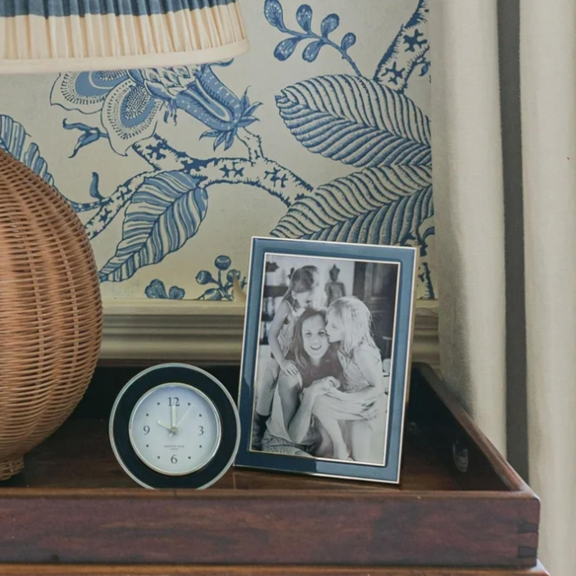 Silver with powder blue enamel, backed with light grey luxury velvet. Able to stand both Landscape and Portrait. Keep dry, clean with a duster.