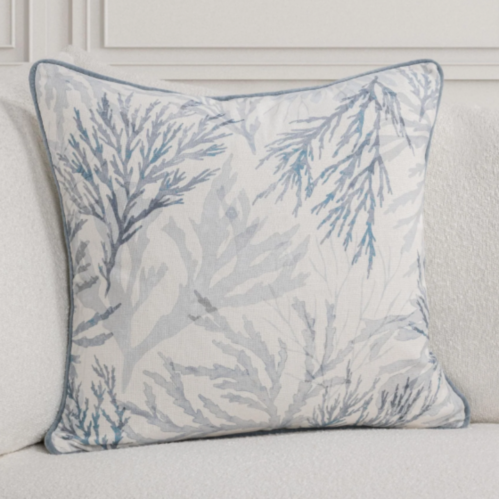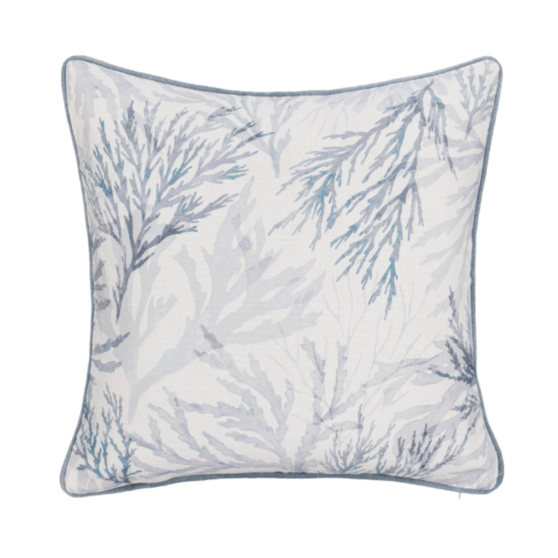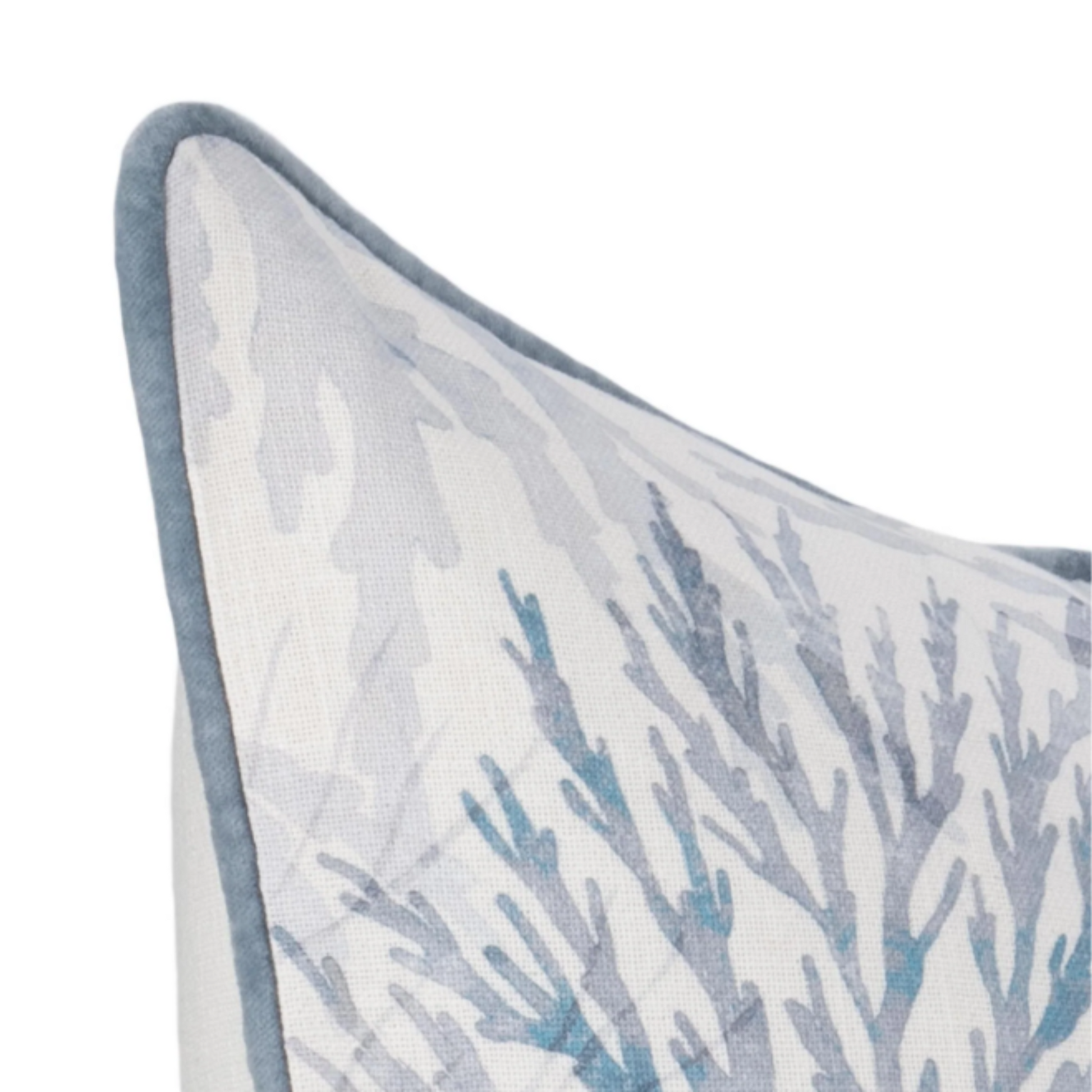 A hand-painted, translucent coral design—rendered in soothing ocean-inspired hues—evokes the feeling of being immersed in a vibrant reef. Printed on sustainably sourced cotton and framed with a velvet trim, this pillow strikes the perfect balance between laid-back charm and statement-making style.