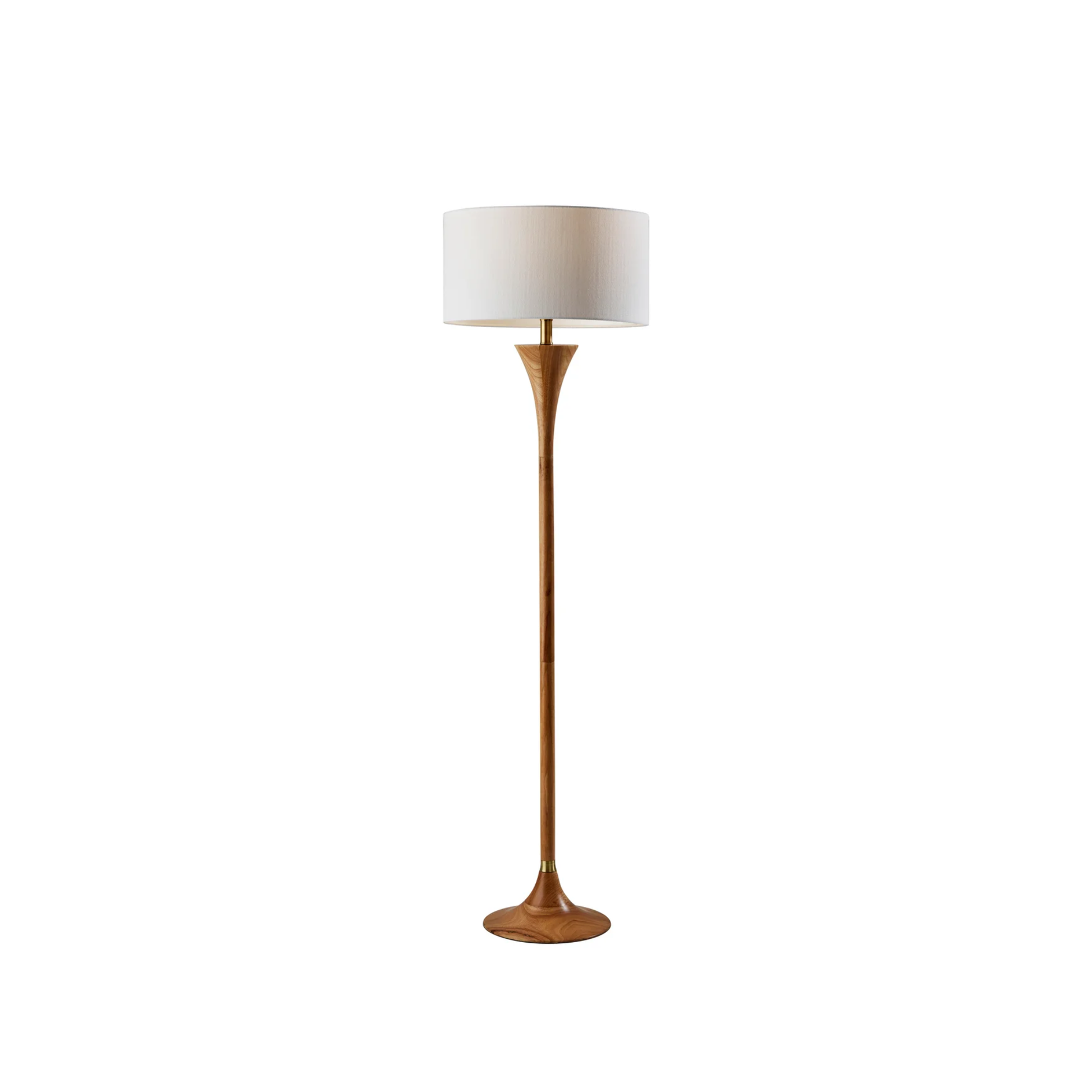 Brighten your room with the natural style of the 60 tall Rebecca floor lamp. With a stem that tapers in the center, an accent band of antique brass, and a short drum shade, this lamp exhibits an elegant silhouette and styling. The 10 diameter round base and matching stem are made of rubberwood with a natural finish that highlights the wood grain. The lamp also features a short 9 high by 17 diameter drum shade in white textured fabric that perfectly complements the soft wood tones and metal accents. Operated by a rotary socket switch to easily turn it on or off, the Rebecca floor lamp houses a 100W bulb (not included) and features a 6' clear cord.