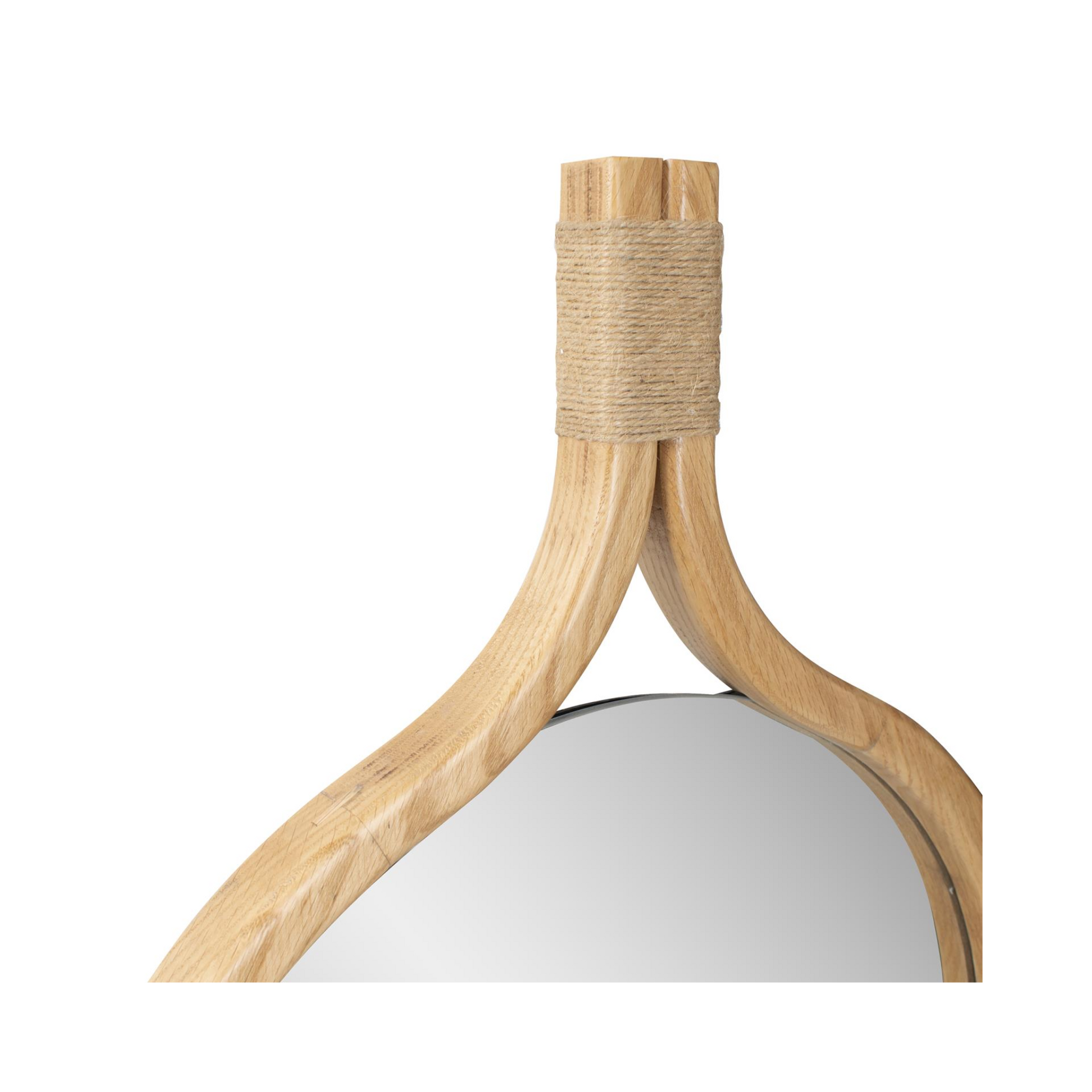 Framed in honey-colored wood, exuding warmth, and character, this mirror has a smooth surface frame that extends seamlessly until it reaches a unique handle wrapped in twine, adding a touch of natural elements. With the woodgrain subtly visible, the frame has a textured look that enhances its appeal.