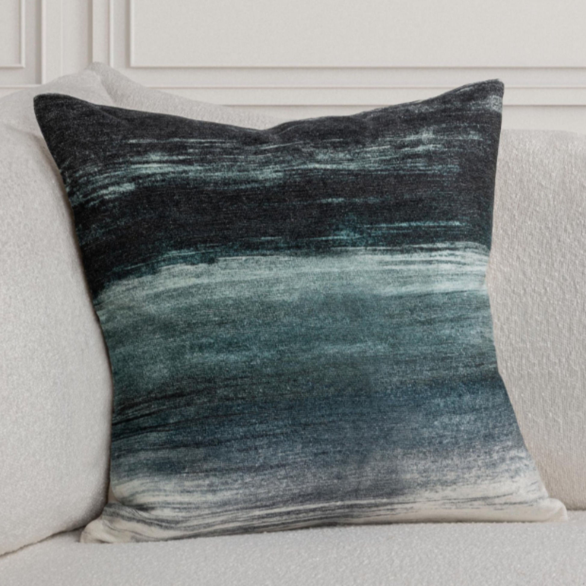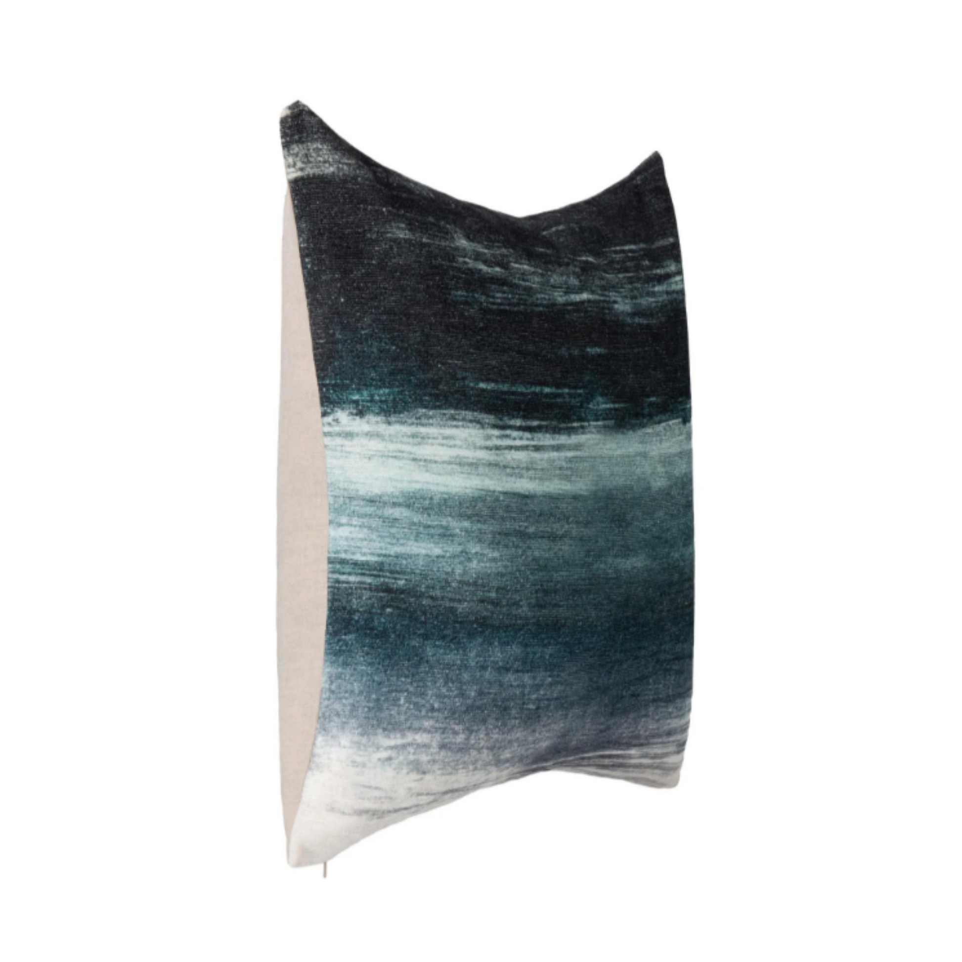 Mimicking the shifting tones of the deep sea, this hand-painted design offers rich color depth and reflective yarns that evoke the feeling of being immersed in the ocean. A seamless hidden zipper and a luxurious feather-and-down fill bring both style and comfort to this plush pillow.
